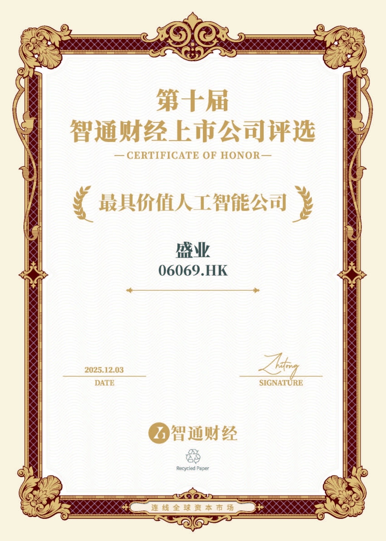2025年12月3日,在国内领先的港美股资讯平台智通财经与中资海外私募基金一站式服务平台新智基金网联合主办“第十届智通财经资本市场年会暨上市公司颁奖典礼”上,盛业(6069.HK)凭借其在人工智能领域展现出的全面领先实力与高成长性,荣获“最具价值人工智能公司”奖。